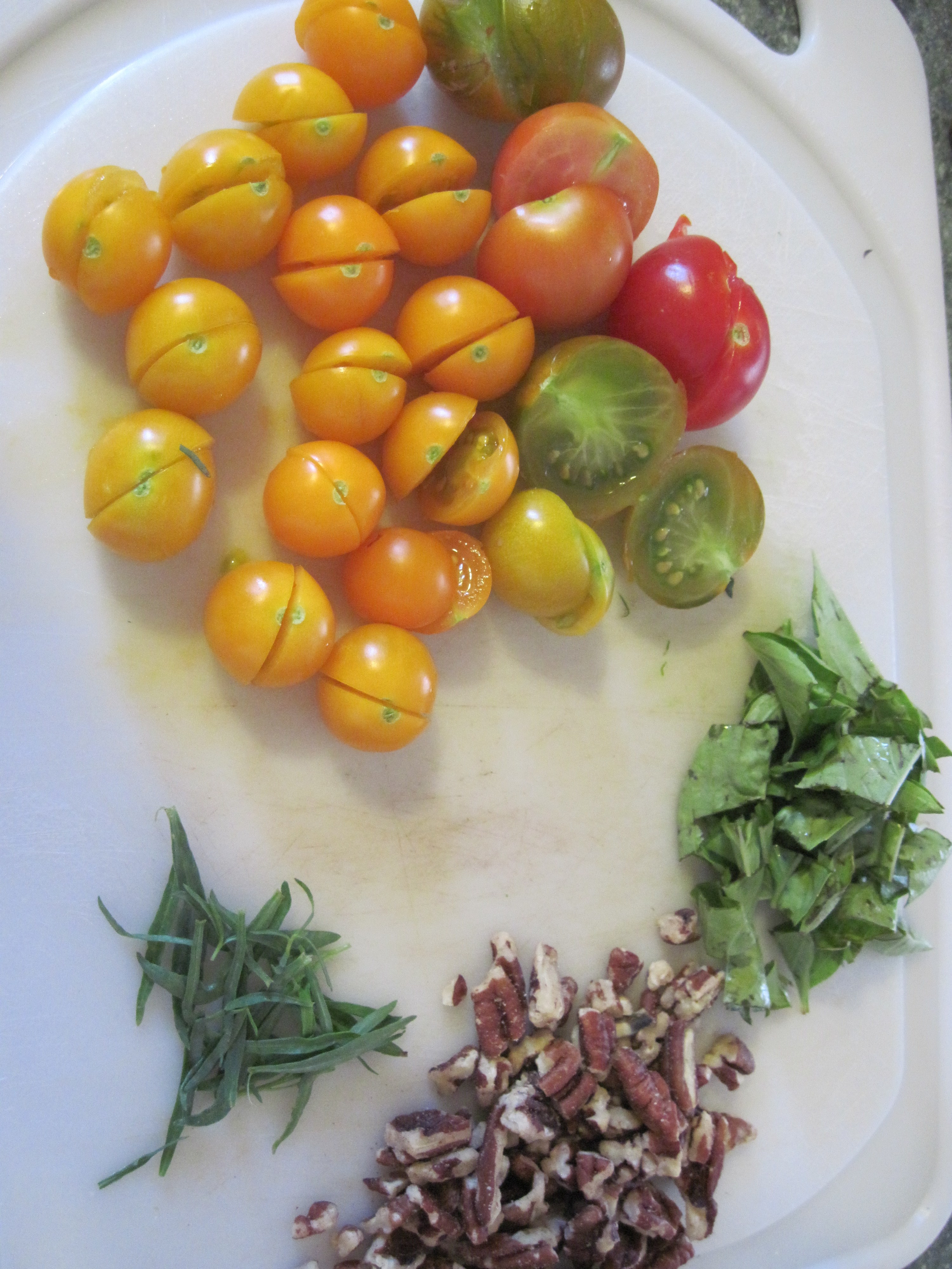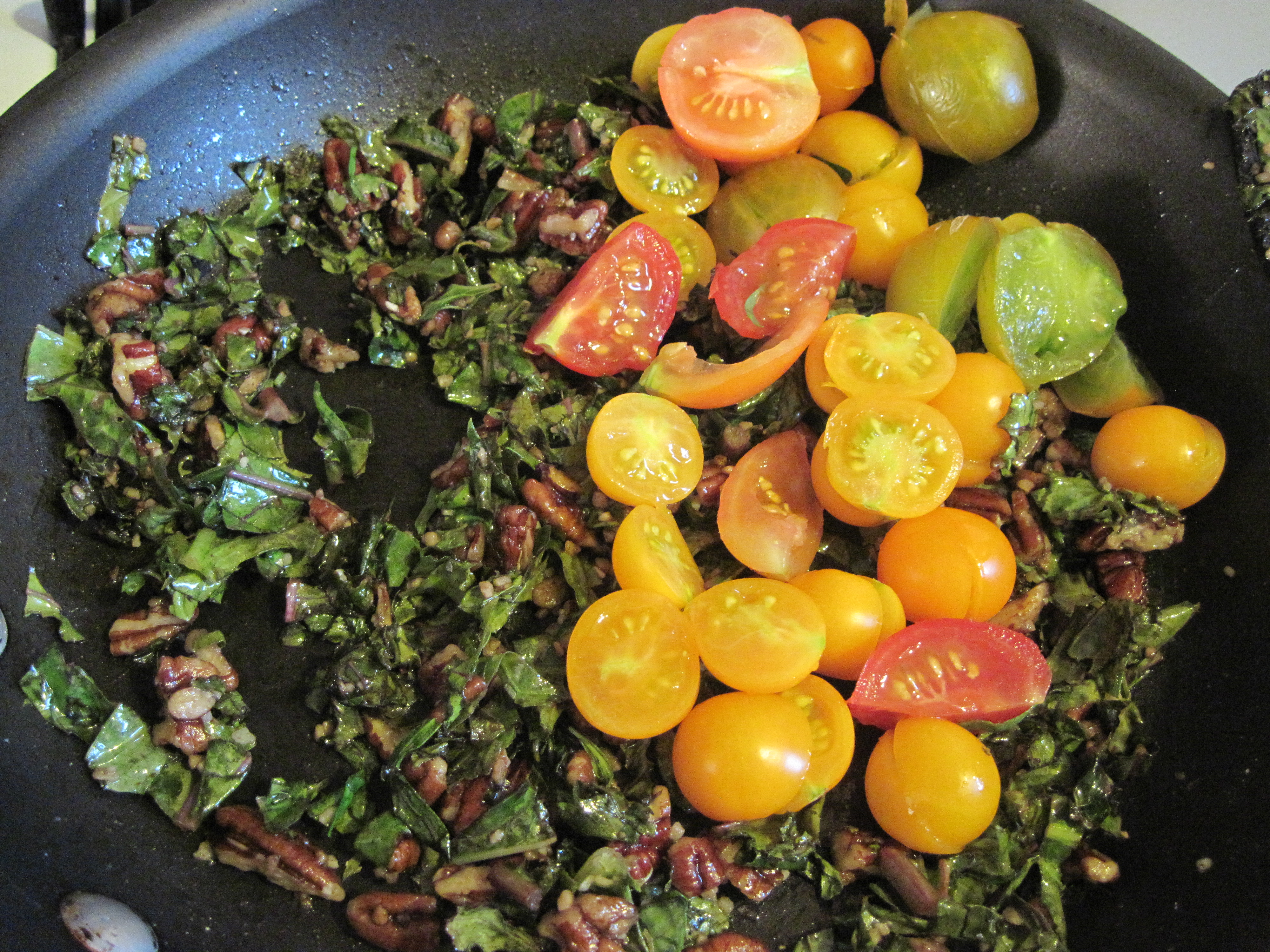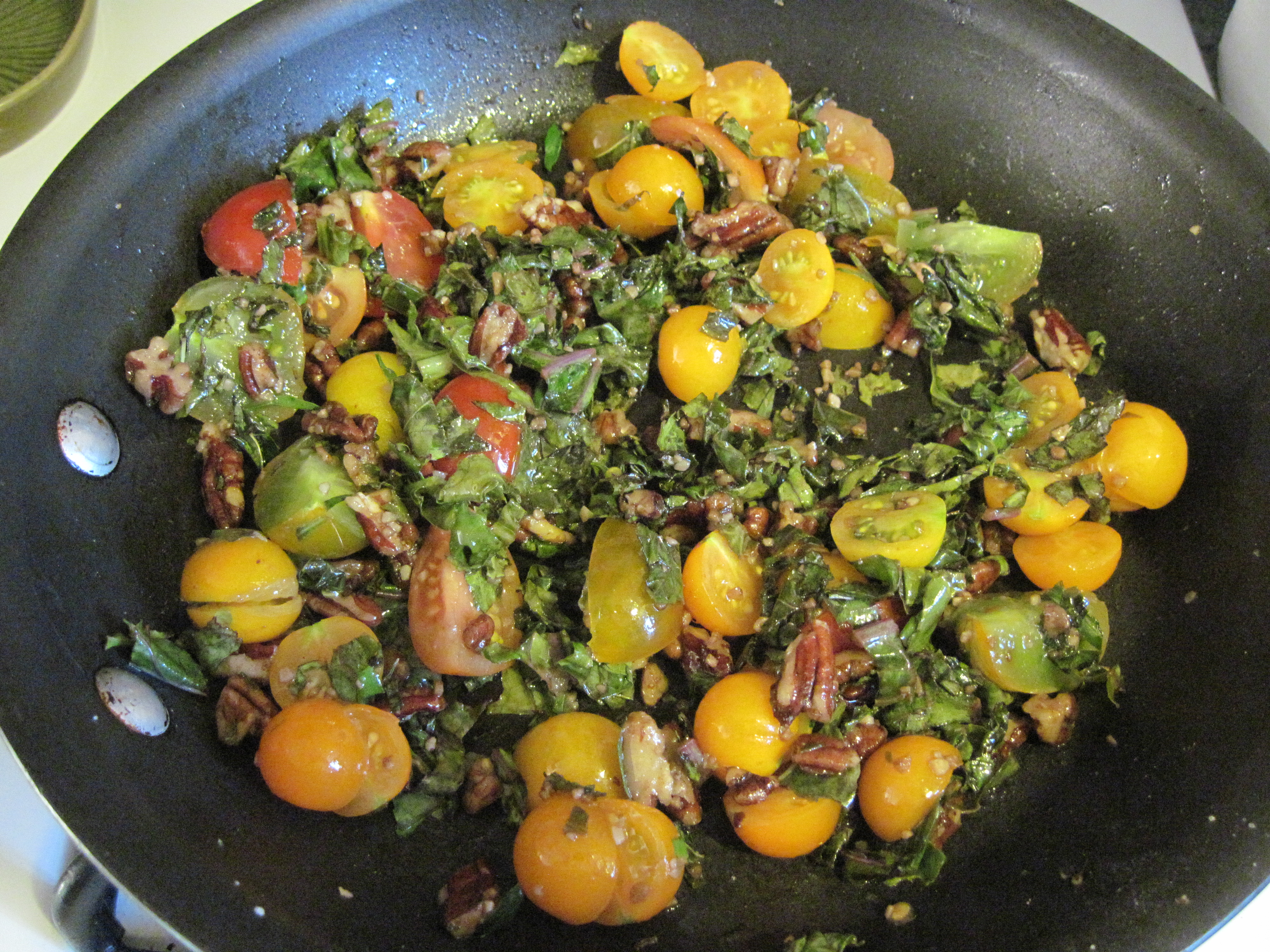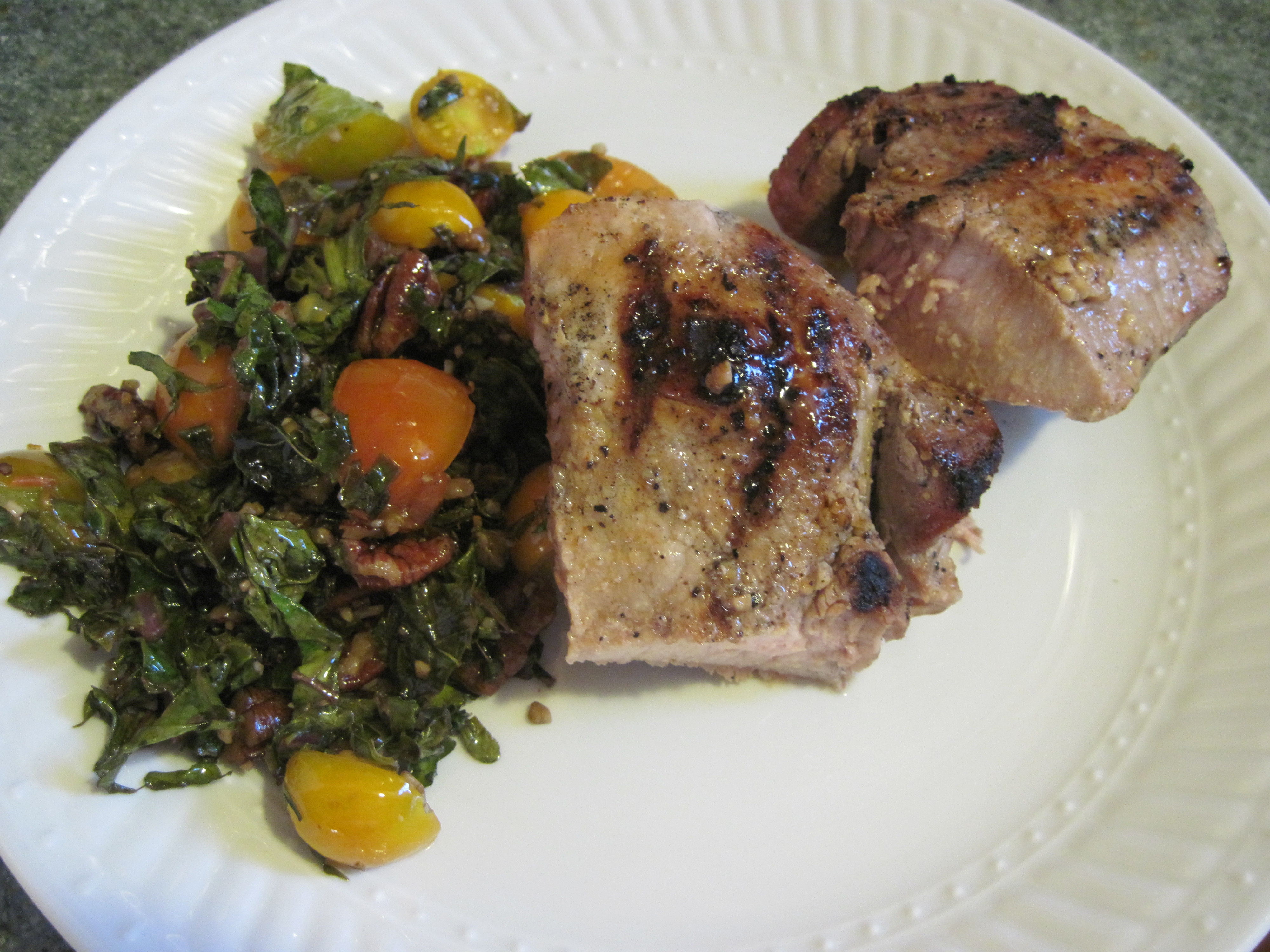 So, what to go with these soon-to-be grilled pork chops? Finding little to work with in the fridge or cupboards, I turned to the garden. My fiance and I are first time gardeners, and nothing has really taken off, but there was a little bit to work with. First, there was kale, which I decided would work well for the base of this dish. In addition, there were enough cherry tomatoes, basil, and tarragon that a creation could be formed. I scoured the cupboard for some nuts, and lo and behold, pecans!
