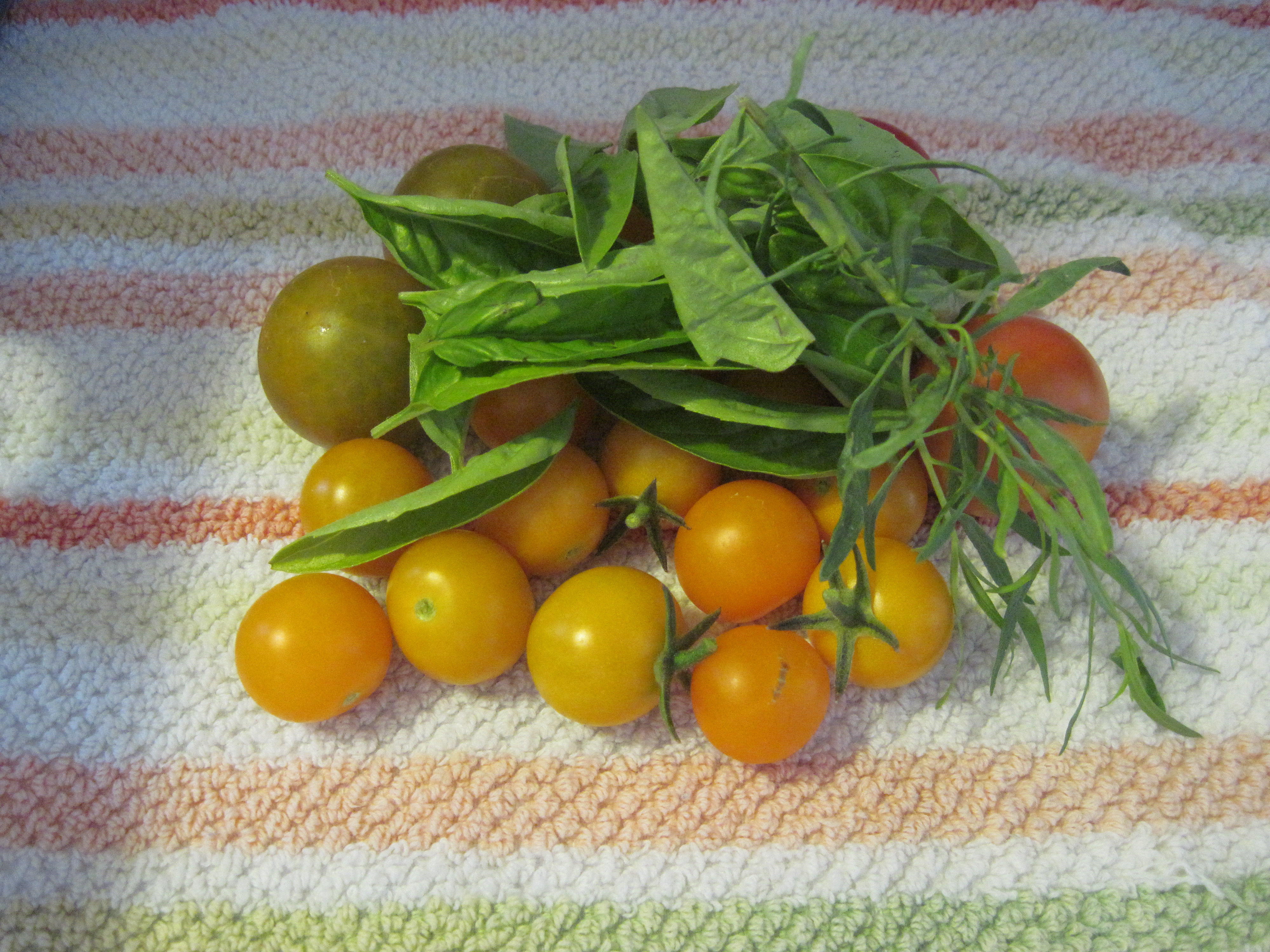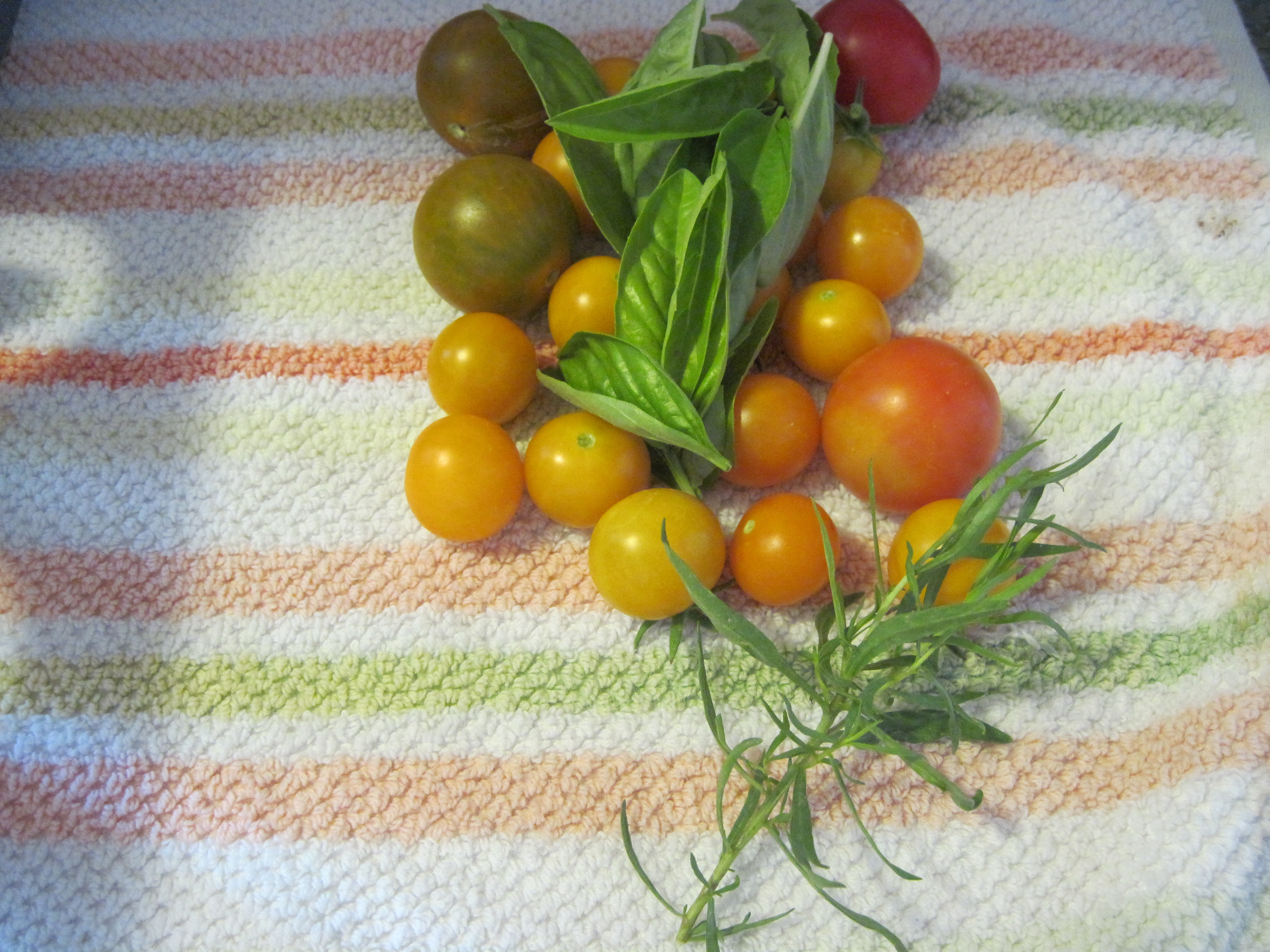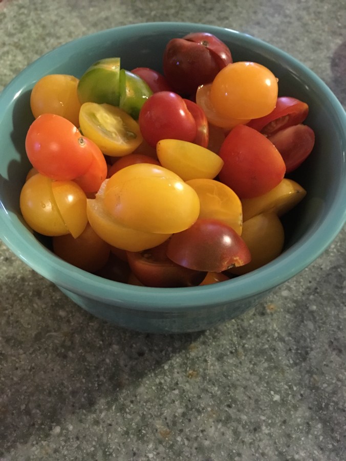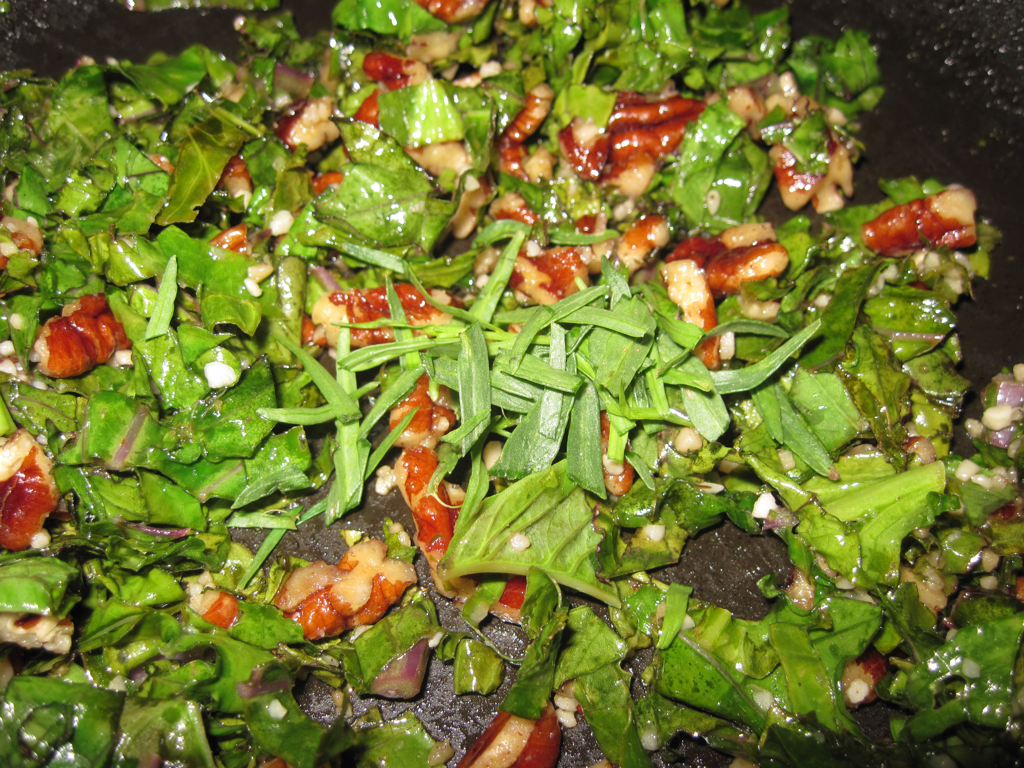 So, what to go with these soon-to-be grilled pork chops? Finding little to work with in the fridge or cupboards, I turned to the garden. My fiance and I are first time gardeners, and nothing has really taken off, but there was a little bit to work with. First, there was kale, which I decided would work well for the base of this dish. In addition, there were enough cherry tomatoes, basil, and tarragon that a creation could be formed. I scoured the cupboard for some nuts, and lo and behold, pecans!