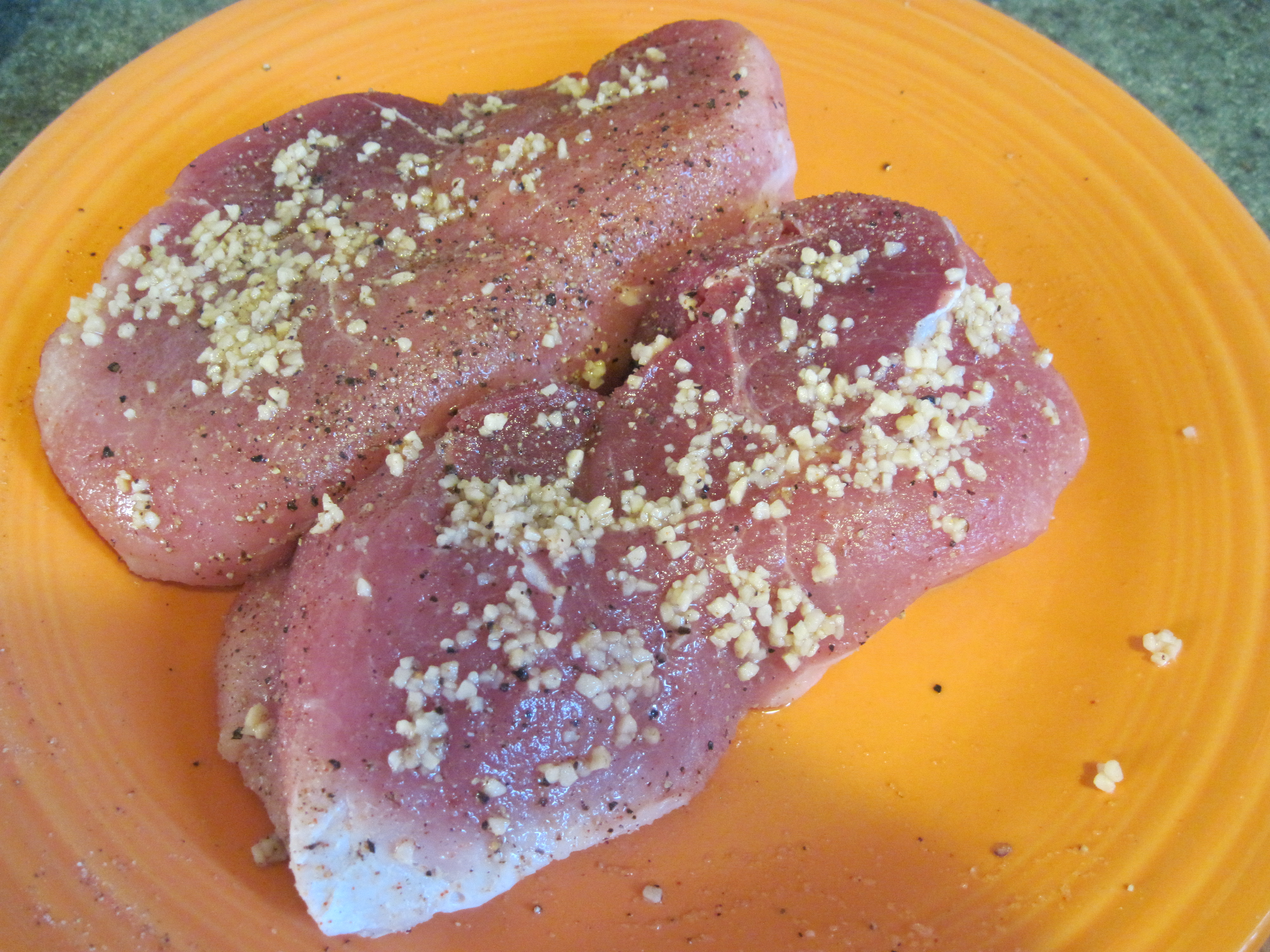 Sunday night I did not feel like going to the grocery store and decided to play, “What’s in the Cupboards?” Turns out I play this game a lot- sometimes I win, sometimes I lose. Turned out, there were pork chops in the freezer. I threw a nice dry rub of salt, pepper and onion salt on each side, accompanied by some minced garlic (I often cheat and buy the pre-minced garlic).IMG_2025