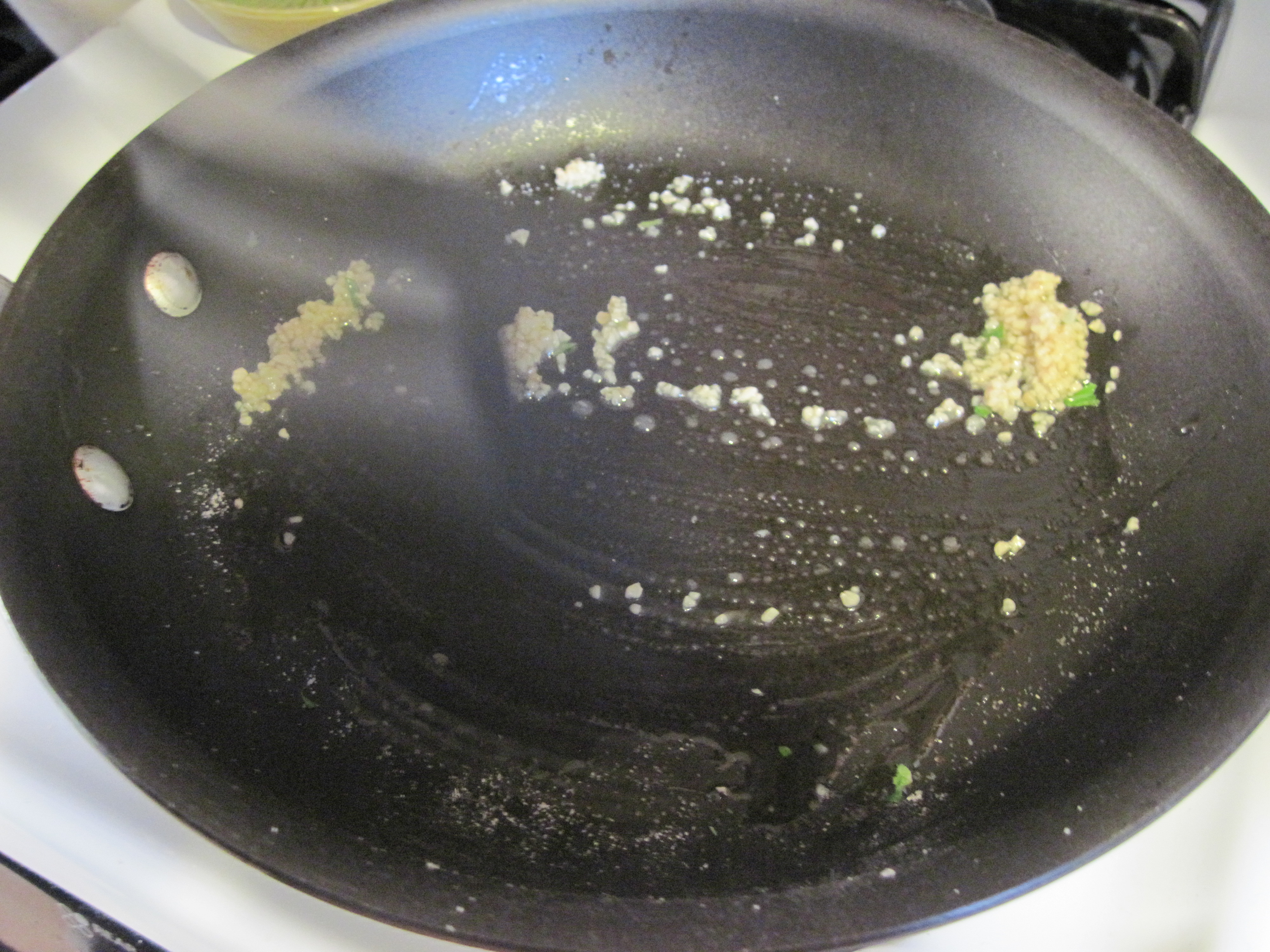 Then, I got out a frying pan, turned my burner to medium heat and put about a tablespoon of olive oil in the bottom. Then, I added about a tablespoon of minced garlic.