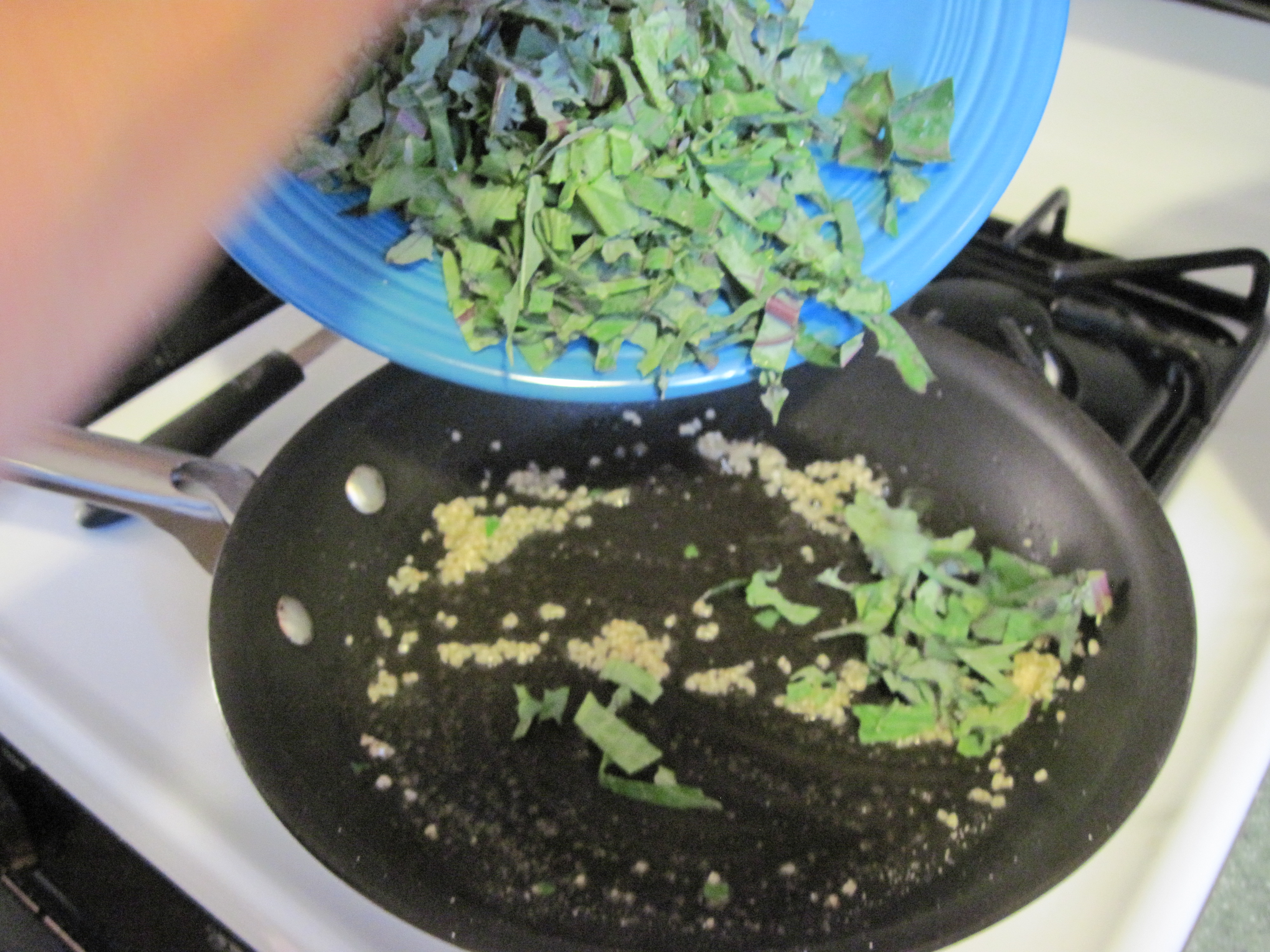 After about a minute, I added my chopped kale. This is a quick recipe, and kale takes the longest to cook, so in first it goes. If you use onion, peppers, or zucchini, I suggest putting them in before the kale and giving them a few minutes to soften.