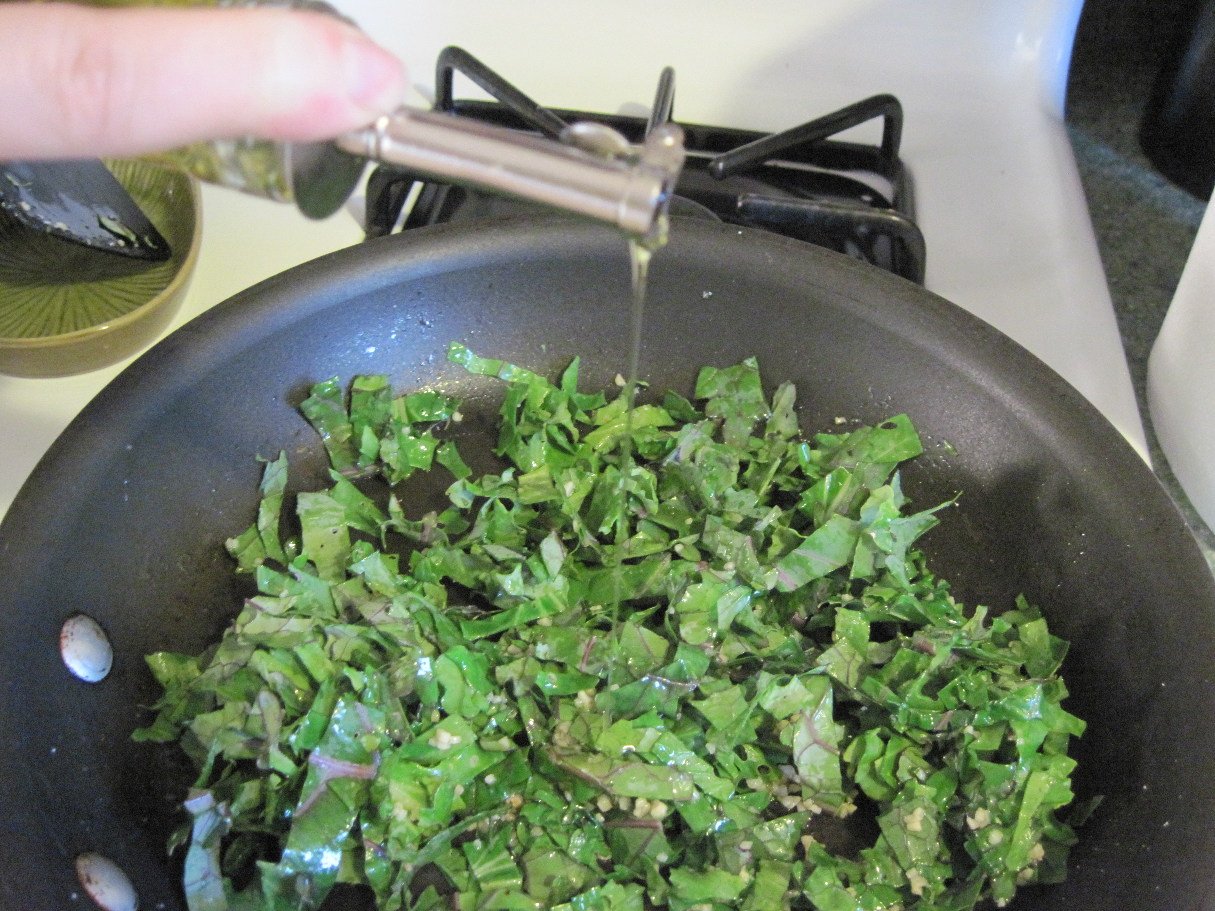 After about 4 minutes, I added the basil. And… another 1/2 tbsp of olive oil. I also added salt and pepper– never forget the salt and pepper!