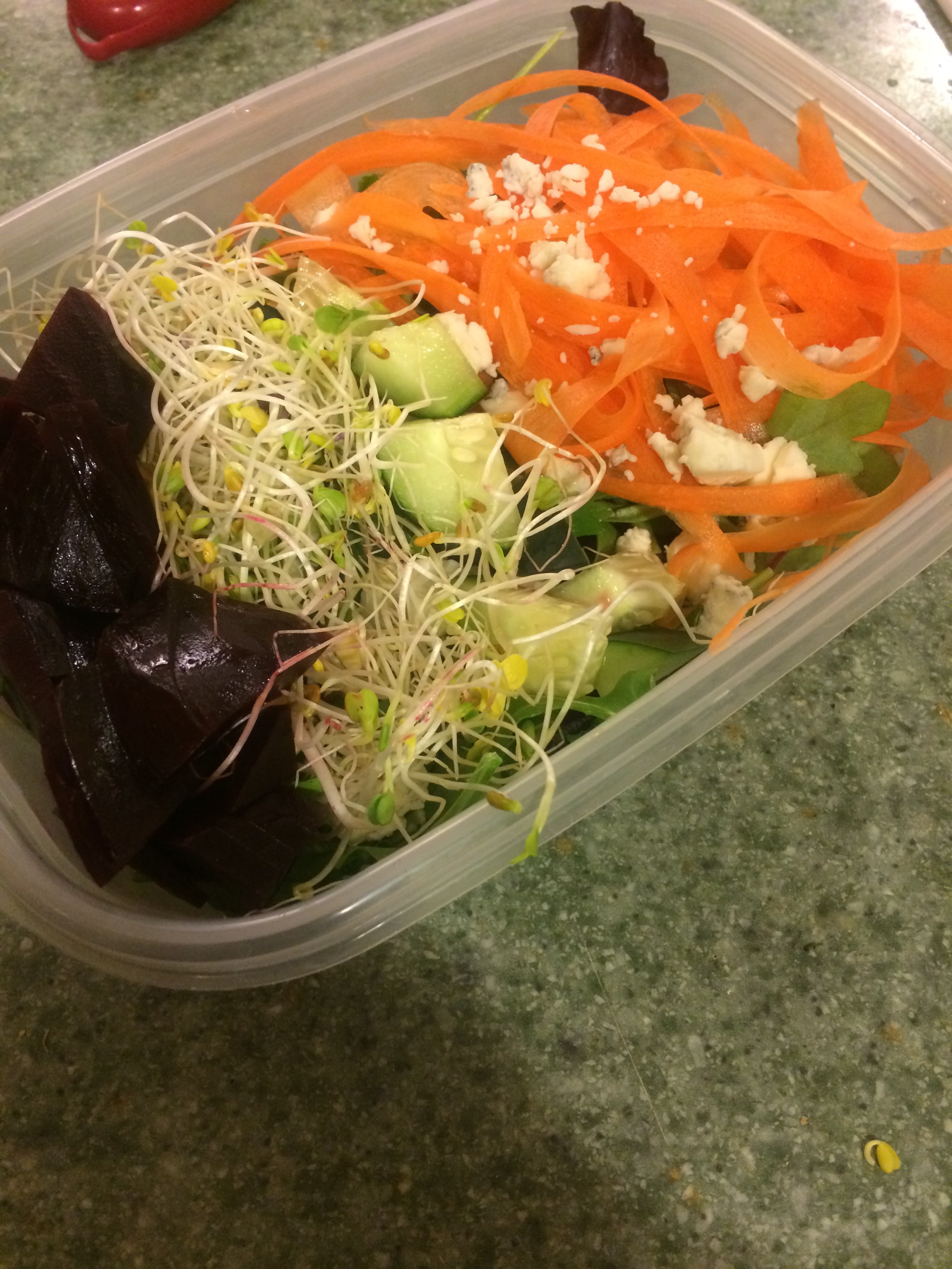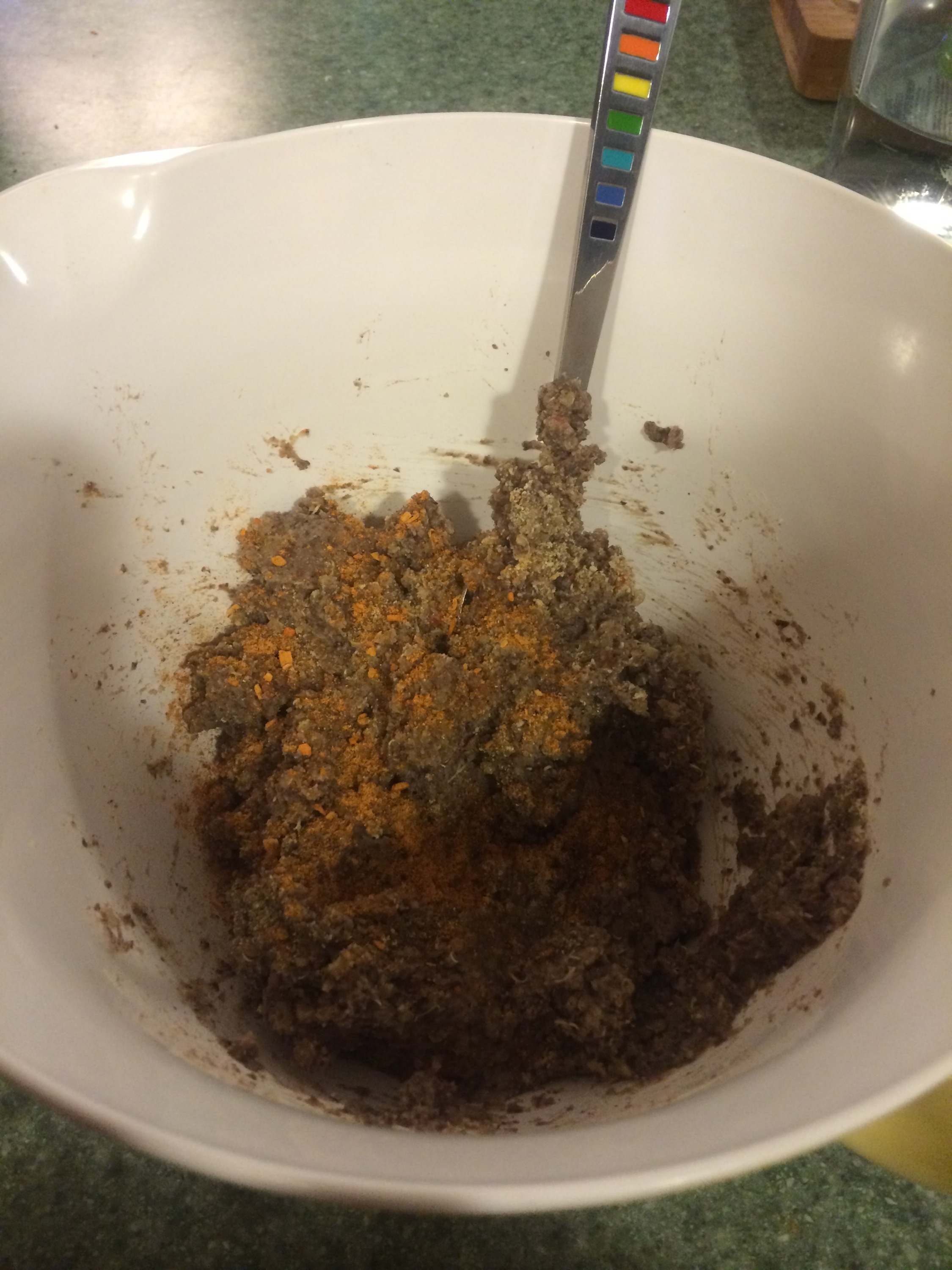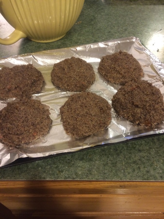I got out the food processor, and combined two cans of black beans, an eighth of raw onion, two cloves garlic, a few slices of red pepper, salt and pepper. After mixing it well I transferred the mixture to a bowl and added approximately a cup of cooked quinoa (made ahead of time), one egg white, 1/2 cup almond meal (Trader Joes) and 1/2 cup of bread crumbs. I added salt, pepper, and taco seasoning to taste. Adjust quinoa quantity and breadcrumbs to liking, in order for patties to stick together.