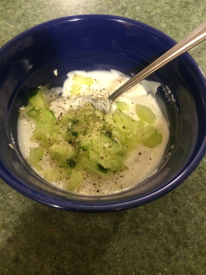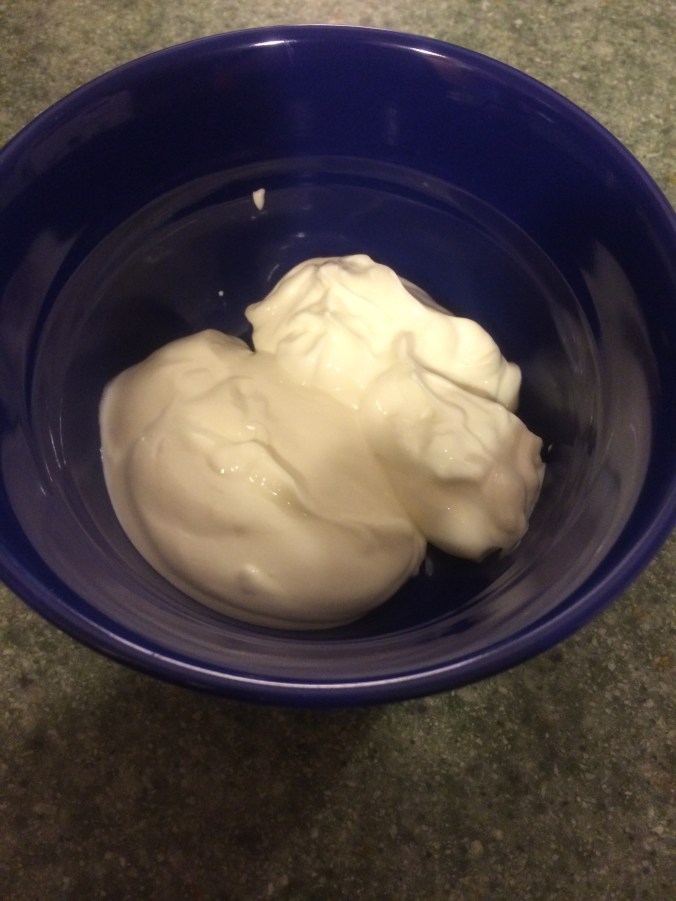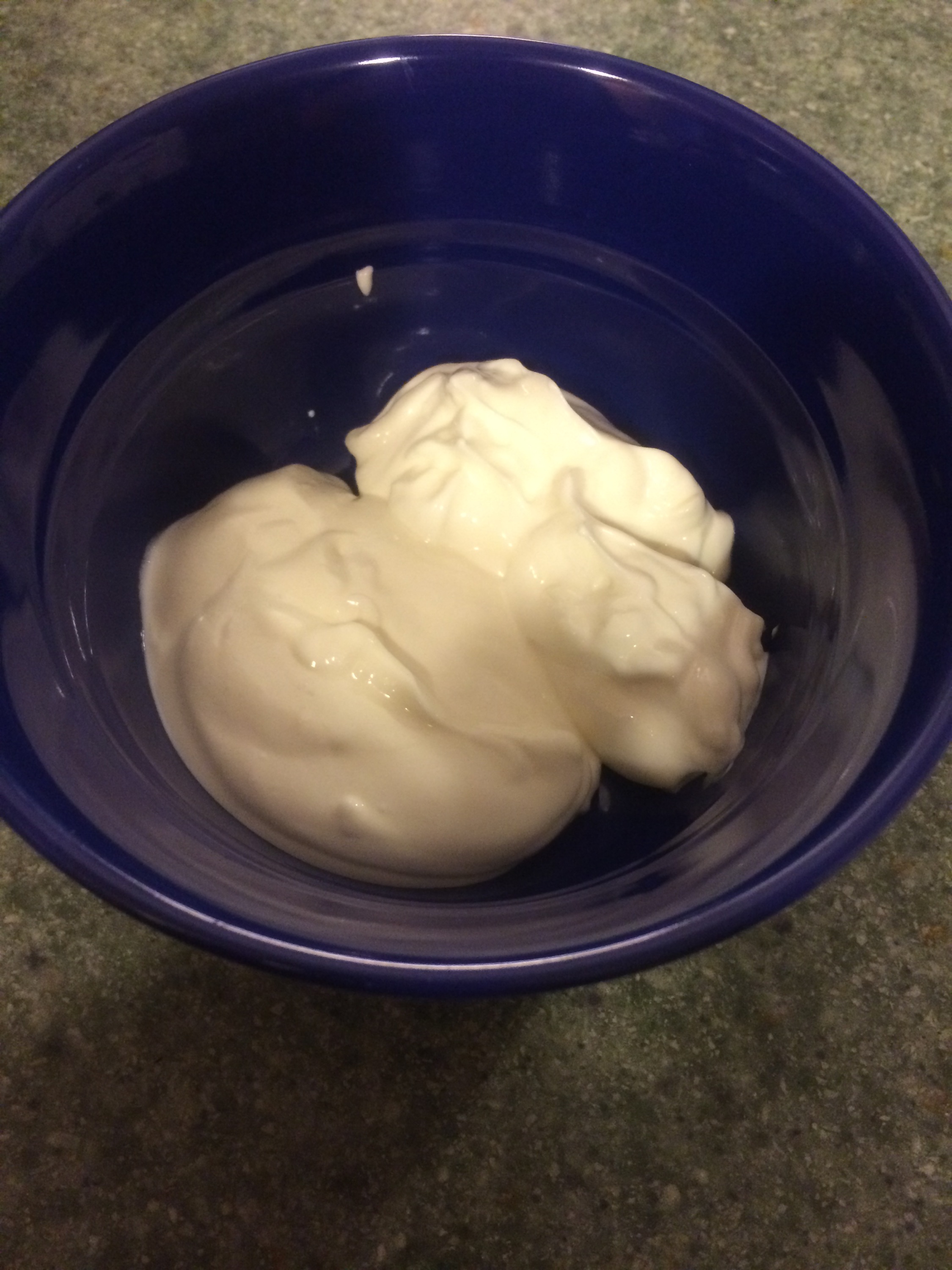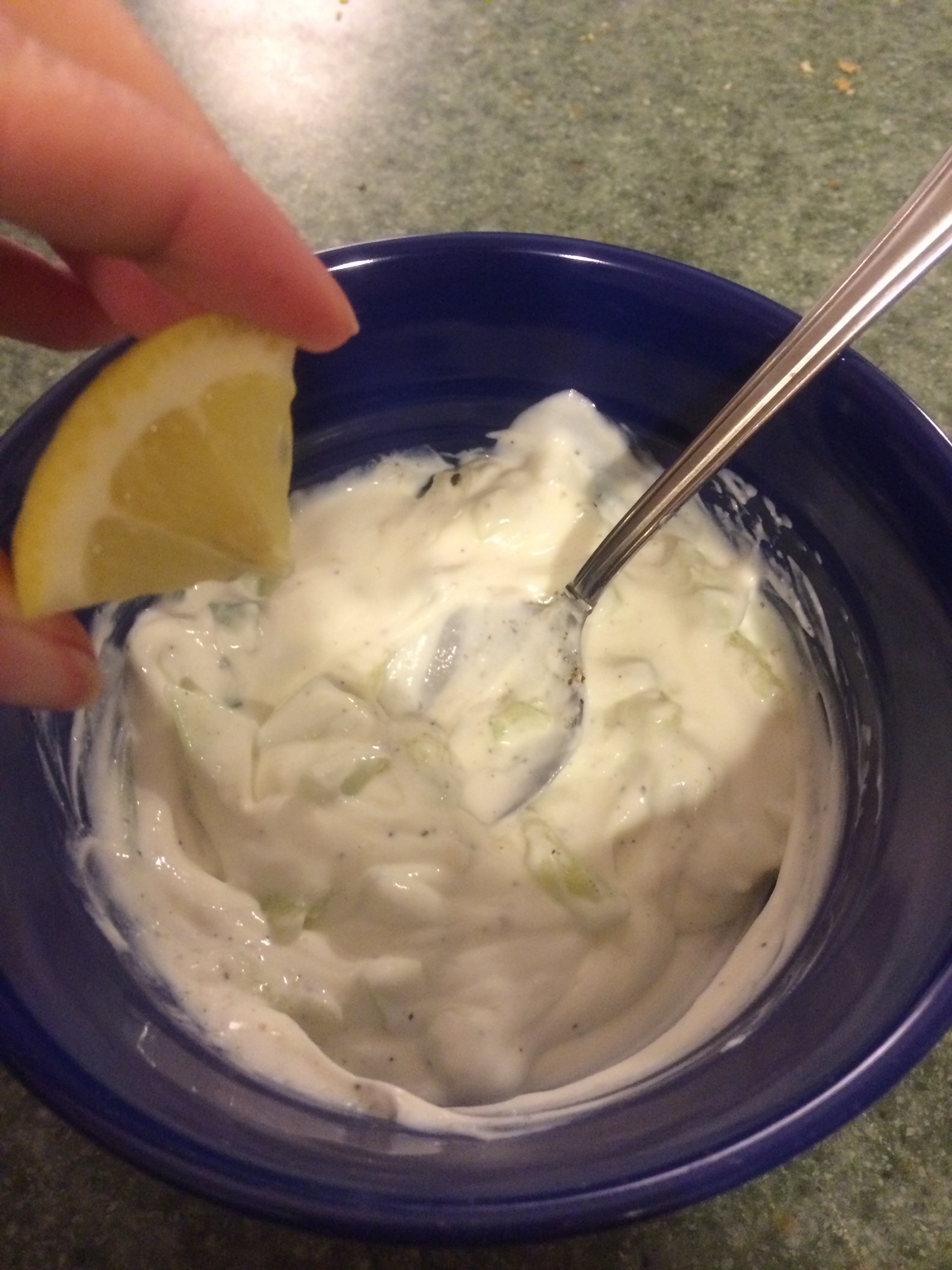 While patties are cooking, make tzatziki sauce. Mix two tablespoons sour cream with two tablespoons plain greek yogurt.