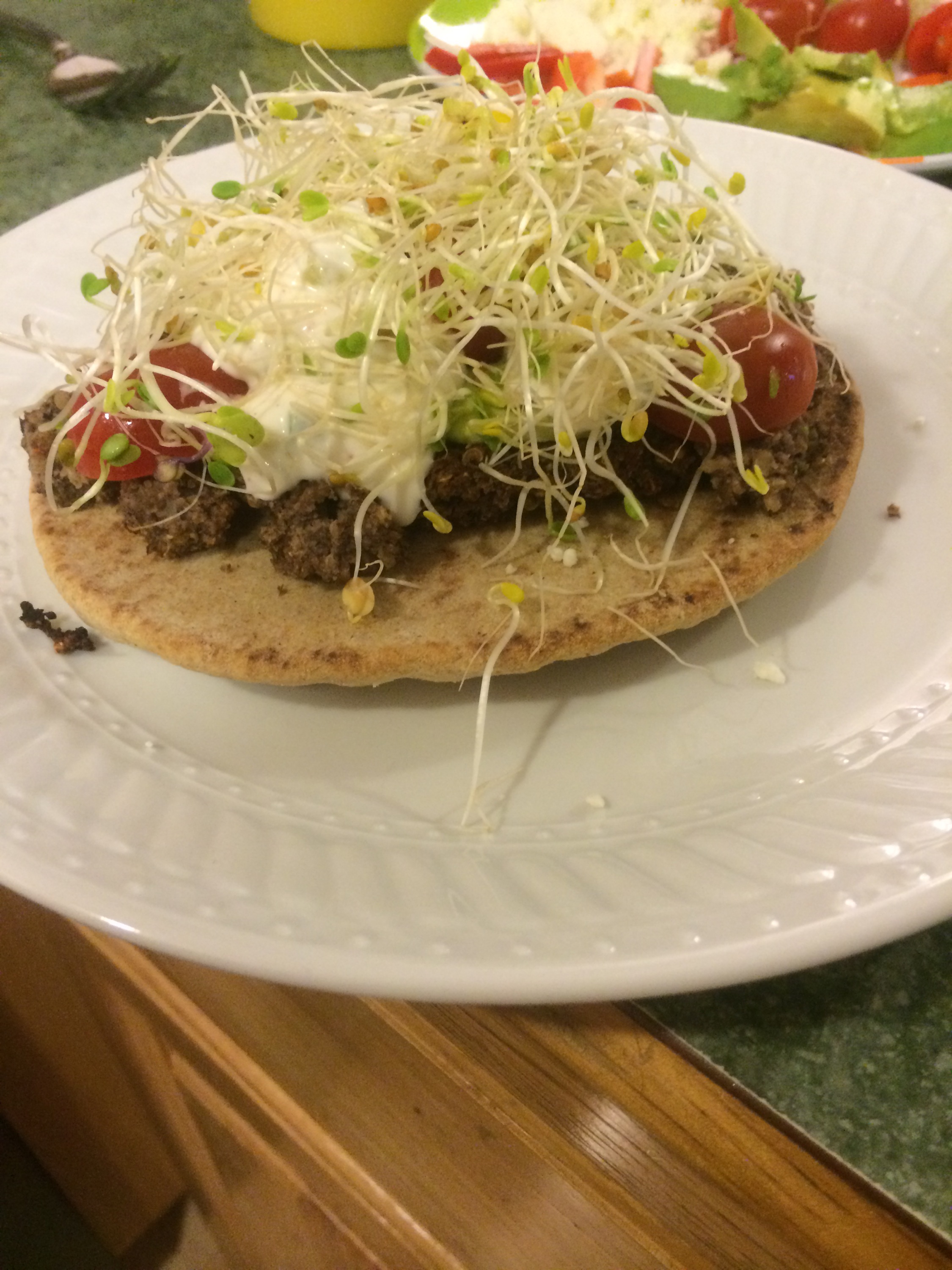 I’ve been attempting to eat healthier, thus thinking of ways to incorporate more vegetables and less fat into meals. I’ve also been trying to do so in a fiscally responsible manner. In that spirit I would like to share these black bean quinoa veggie patties on warm whole grain pitas with veggies and tzatziki  sauce.