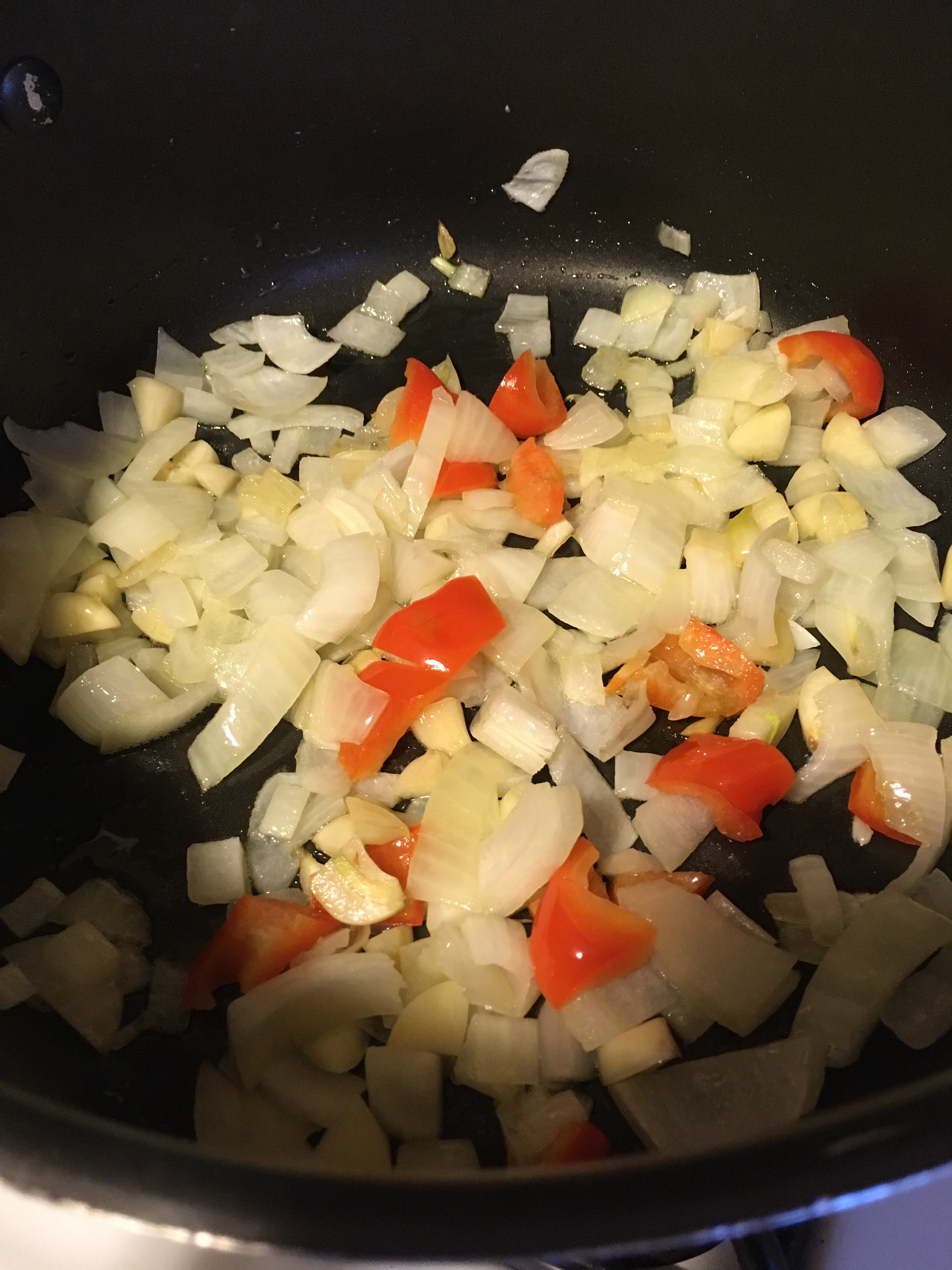 To begin, sauté onions and garlic. I added some leftover red pepper  that I had in the fridge.