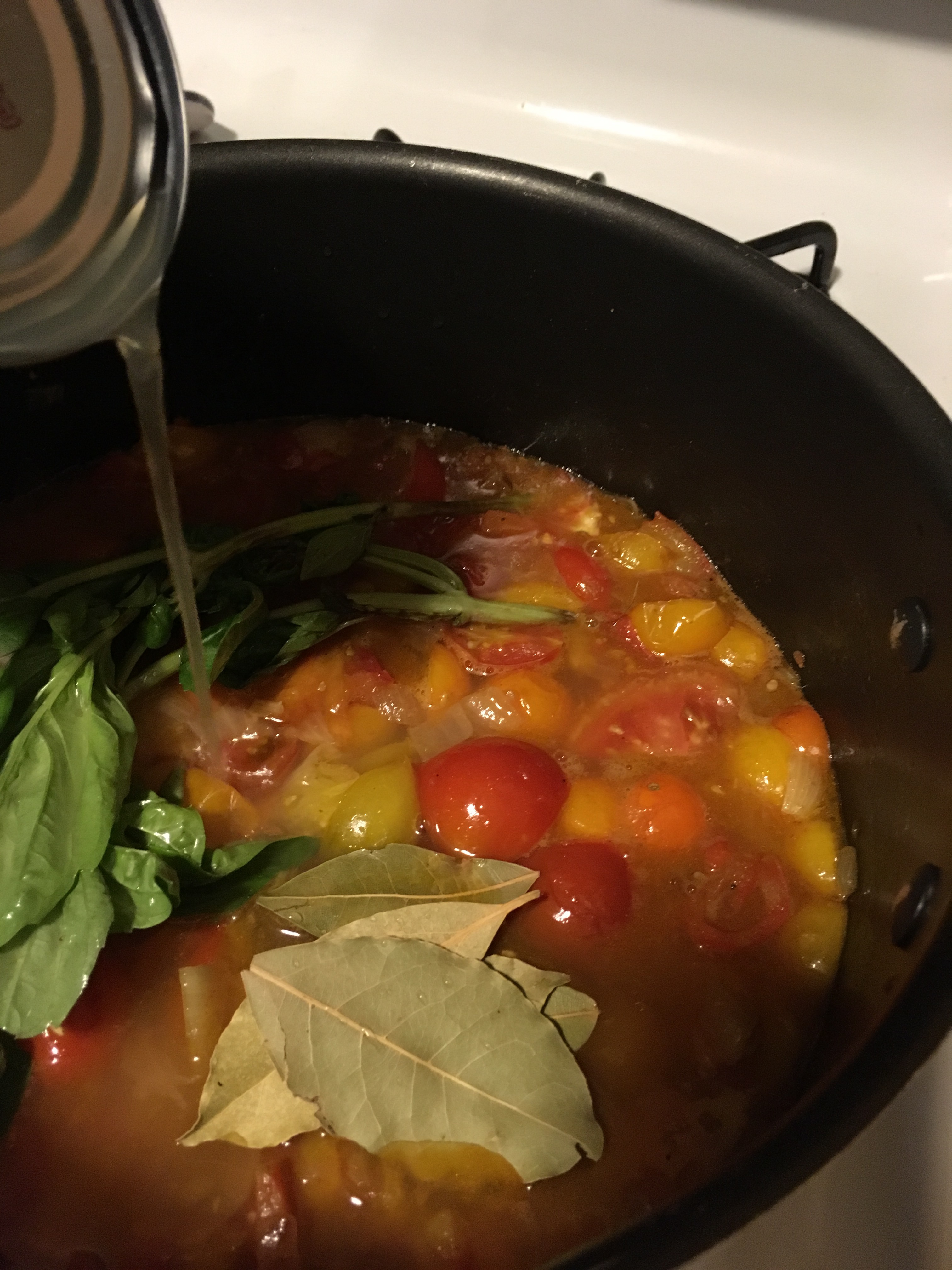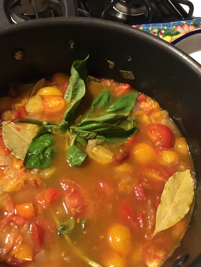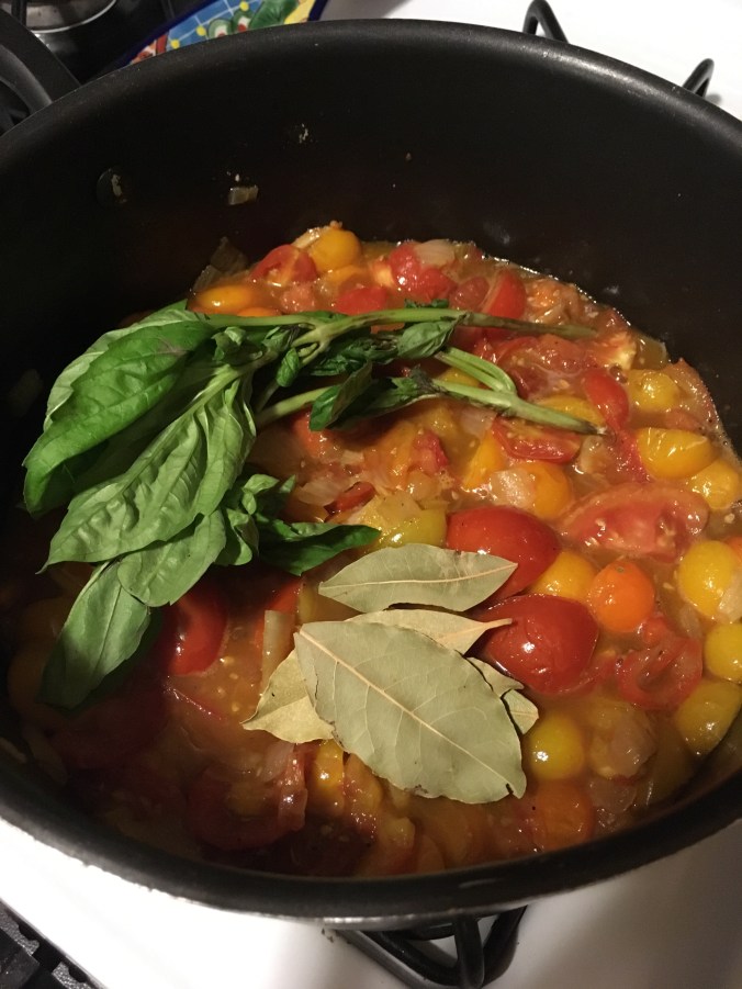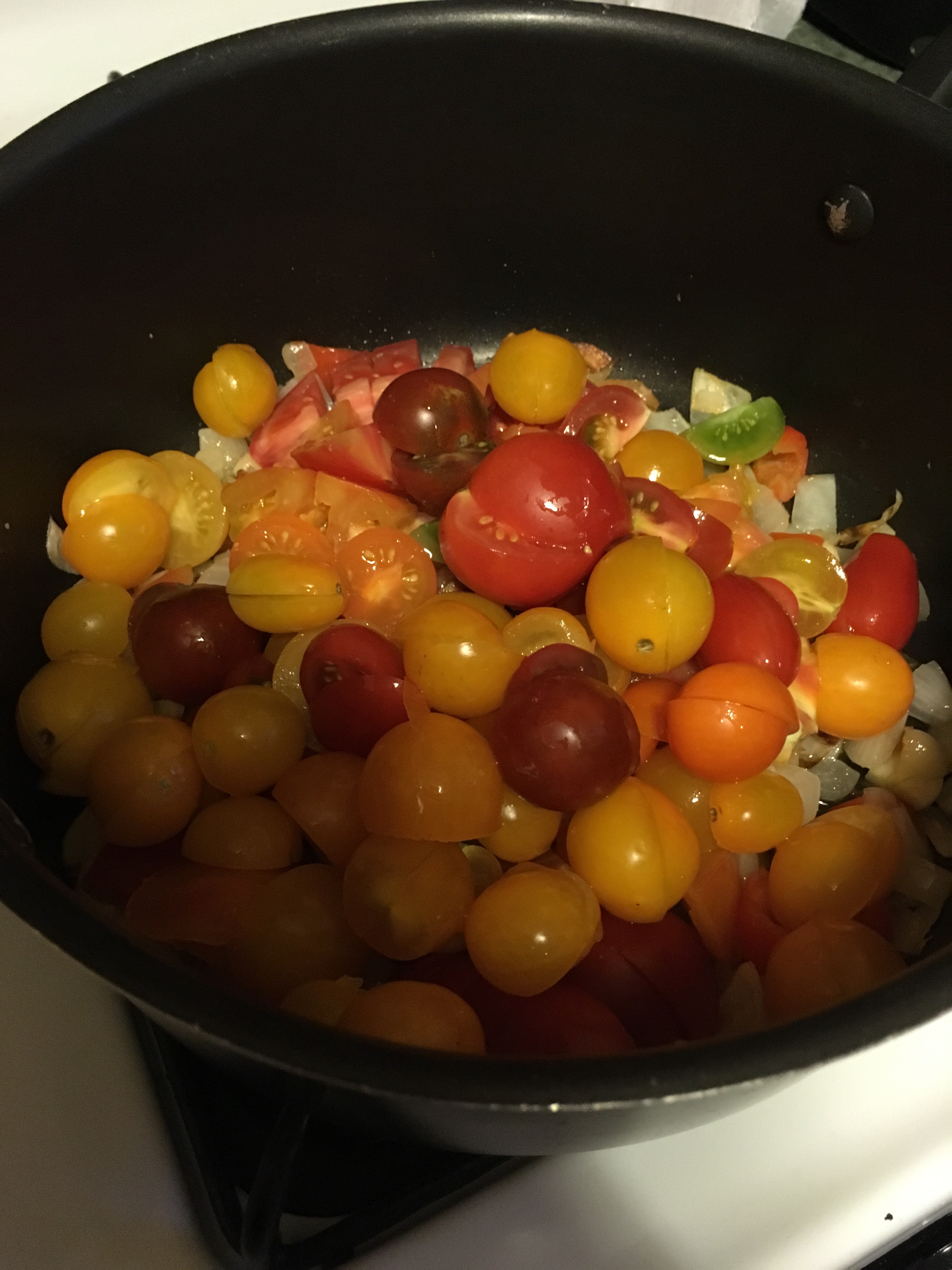 After another minute I put in the cherry tomatoes. For a dish such as this, I am a big fan of throwing in the tomatoes in the final minute or two of cooking; this way they retain their fresh flavor and a bit of firmness; cook too long and you will be left with mushy tomatoes.