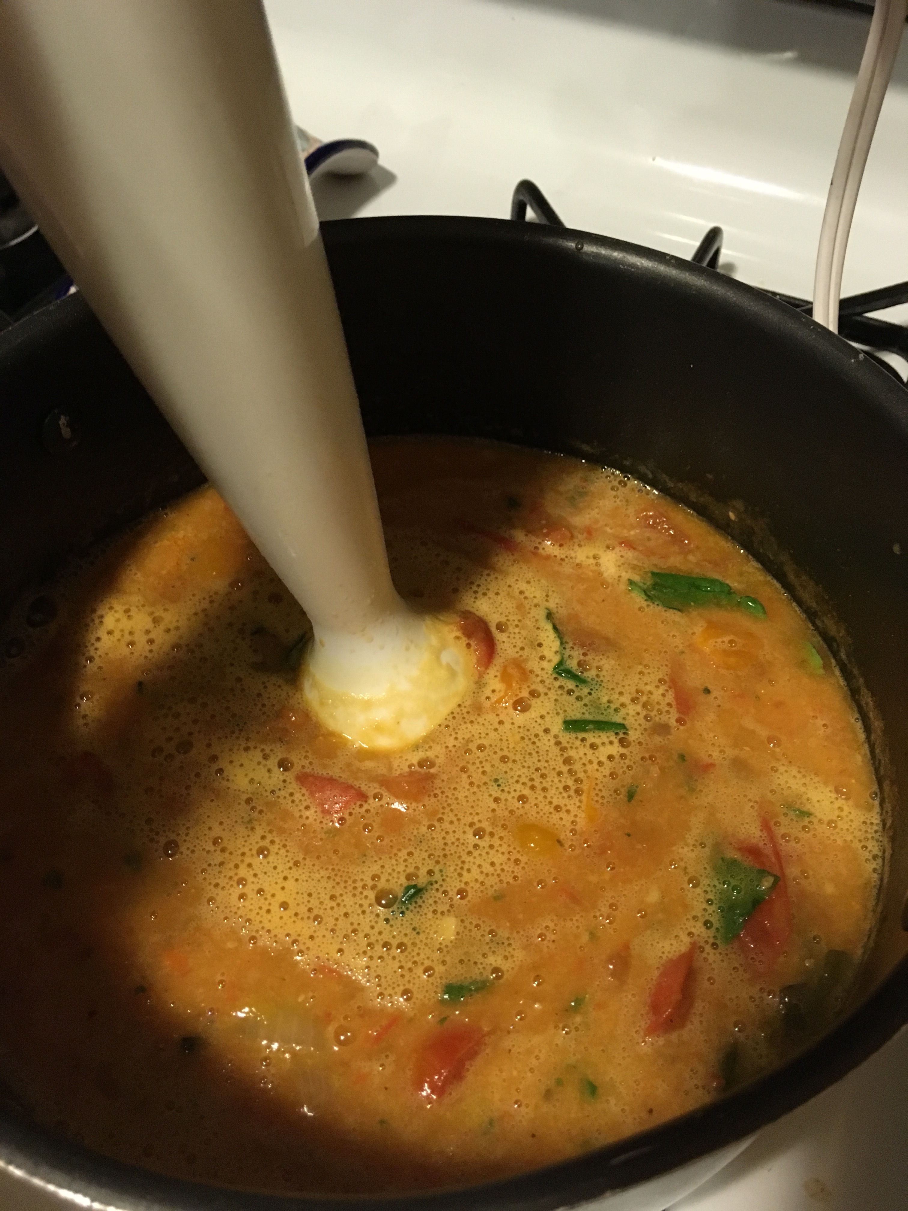 Let simmer for another 15 minutes. Pull yo basil leaves and bay leaves with tongs. If you really like basil, this is the time to add some extra fresh chopped basil. Then, use a hand blender to mix everything together!